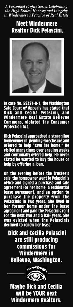 The incredibly violent and insidious psychological ramifications of rape, connected through an “abusive work environment” serves as an unfortunate—yet credible—subtext for the way in which Windermere Real Estate treats employees and defrauded, damaged customers alike. Windermere’s application of aggressive, wasteful and mendacious litigation to stall and ruin innocent consumers serves as the coercive metaphor of corporate power and arrogance: Windermere has no genuine concern for the damage it has done to families or society, It cares only about how to manipulate the law and the courts to avoid any legal responsibility—and about how to deflect bad PR with disingenuous promotion like "Building Communities" and "The Windermere Foundation."